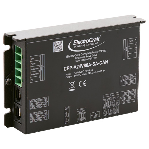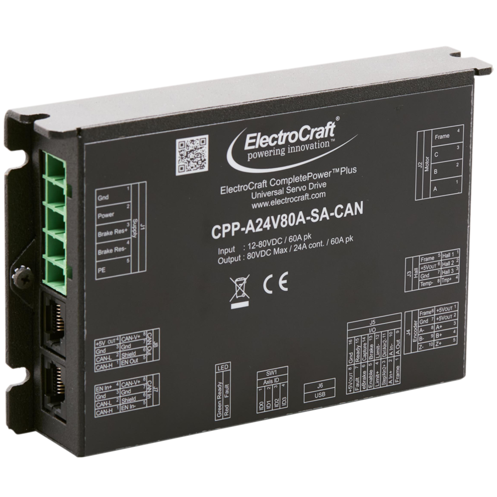 | CPP-A24V80A-SA-CAN | Universal Drive, compatible with Brushless DC and PMDC Brush Motors, 60A peak, 24A continuous, 12 to 80 VDC, speed, torque, position control, CAN bus communications | Buy Now |