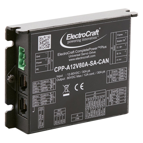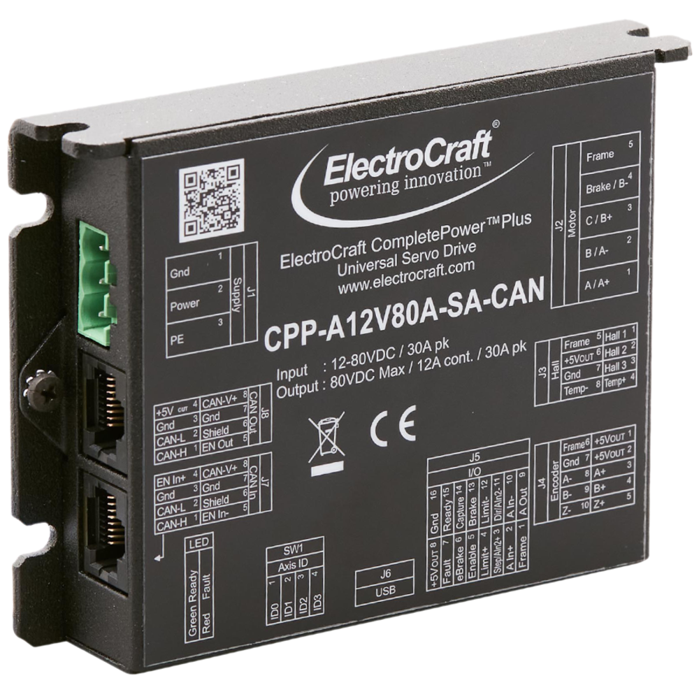 | CPP-A12V80A-SA-CAN | Universal Drive, compatible with Brushless DC, PMDC Brush, Open and Closed-Loop Stepper Motors, 30A peak, 12A continuous, 12 to 80 VDC, speed, torque, position control, CAN bus communications | Buy Now |