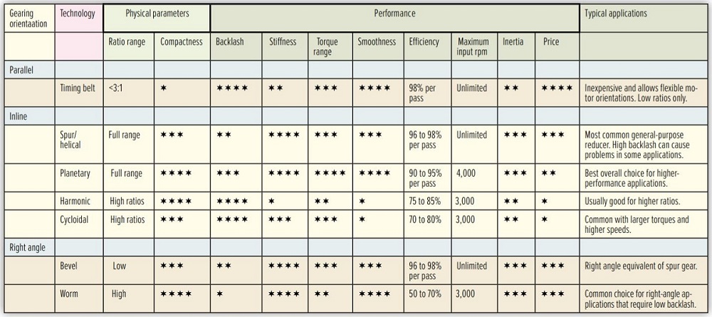 belt, spur or helical gear, planetary gear, harmonic drive, cycloidal